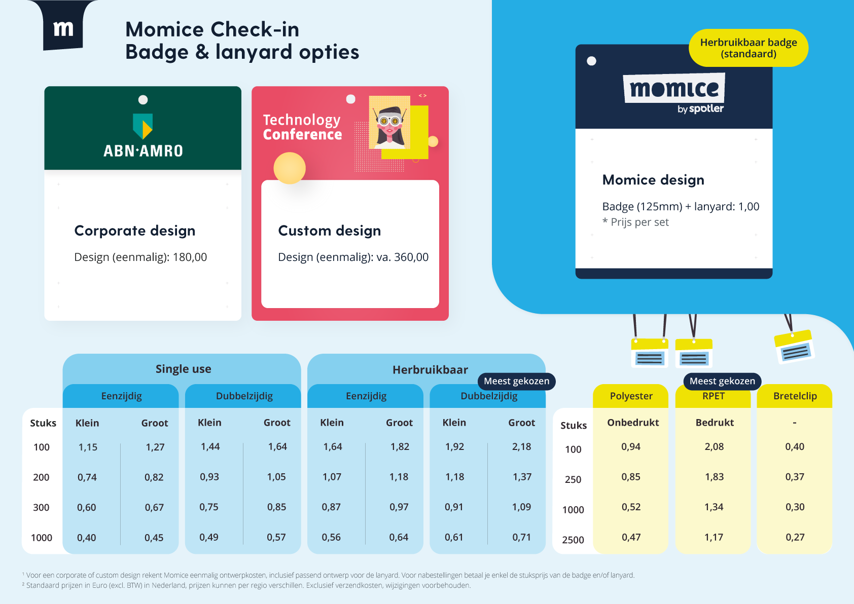 *Let op: dit zijn richtlijnen. Prijzen kunnen variëren afhankelijk van de keuze voor type badge/lanyard, design en aantal deelnemers.